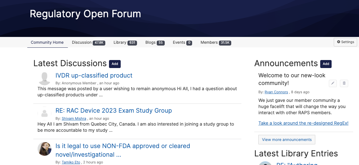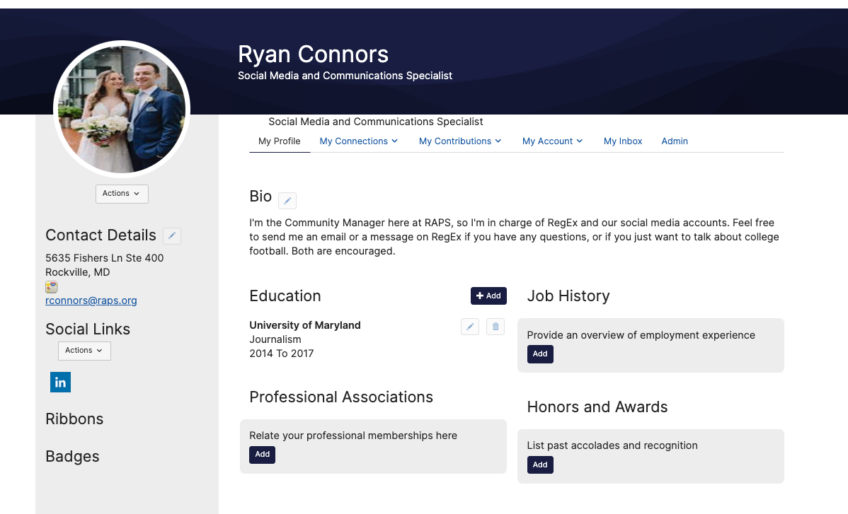 Customize your profile settings: While on your profile page, click on the tab for My Account. Here you can set up how you want to receive emails from the community, how much of your profile you want visible to other members, design the signature area that appears under your discussion posts and more. If you have any questions about what a certain setting means, please email the Community Manager at regex@raps.org for help.