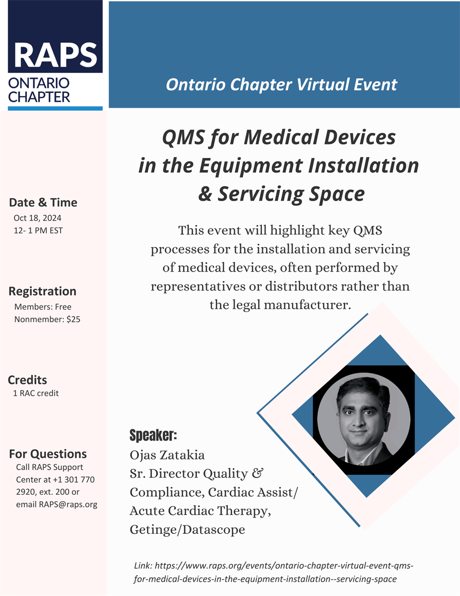 Gentle Reminder: Ontario Chapter Virtual Event: QMS for Medical Devices in the Equipment (Installation & Servicing) Space